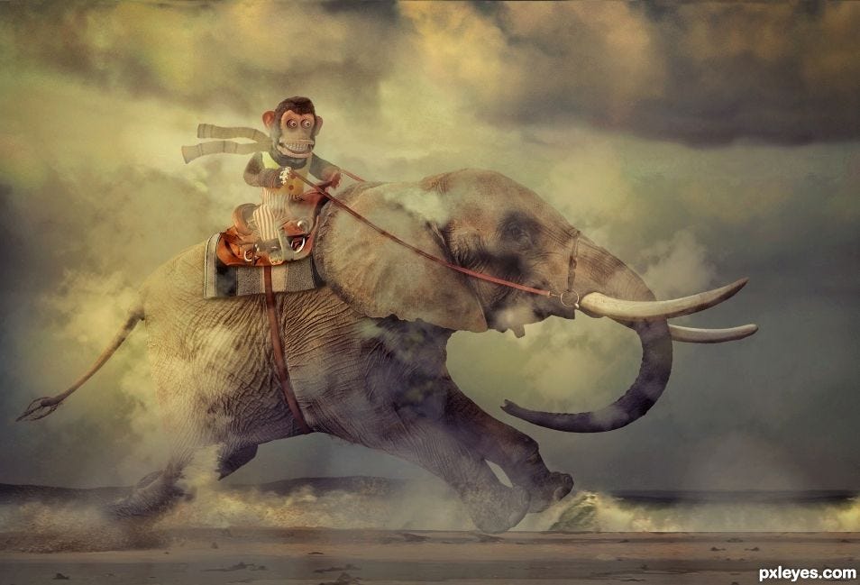 The monkey is the same size for both men and women (rational), but the size of the beast (elephant) they are riding is different. Women's emotions are like a monkey riding an adult elephant. When things are going smoothly her monkey is just riding along on the elephant with no problems. She's aware of her feelings, she's connected to them and has them under control, all is well. When a woman says she is overwhelmed- she is feeling like a monkey riding an out-of- control elephant.